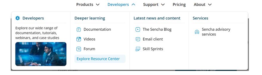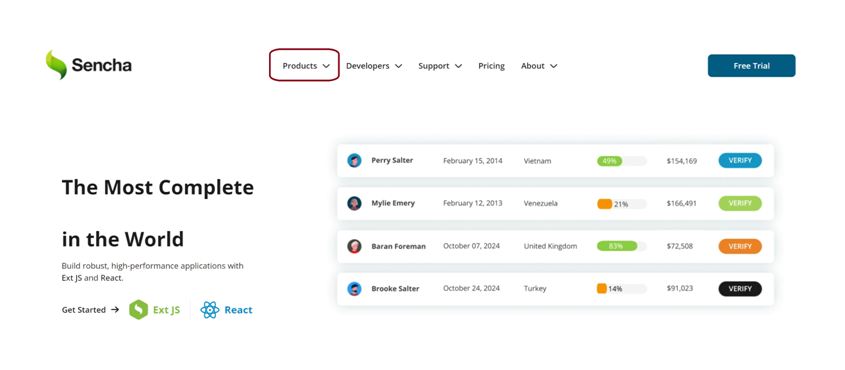 1) Open the Sencha website at https://www.sencha.com/ and click on the Products dropdown.