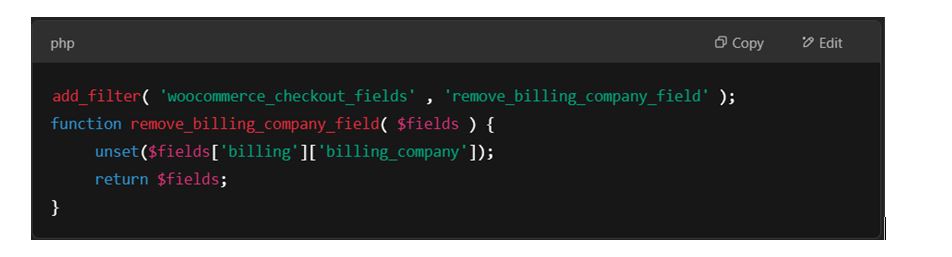 While plugins do help, they still offer limited customization. If you’re comfortable with the code, you can take full control of how your checkout flow looks, feels, and works. Here’s a simple code snippet to remove the “Company Name” field: