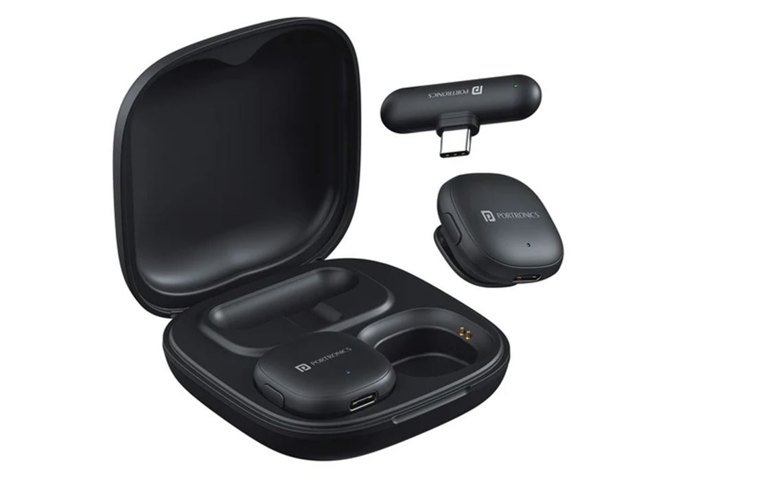 Wireless microphones like PortronicsVlogMate One are game changers. It’s a dual wireless mic kit with a plug-and-play Type-C receiver, AI-powered noise cancellation, and real-time audio sync. Plus, it captures 360° sound and works up to 30 meters away.