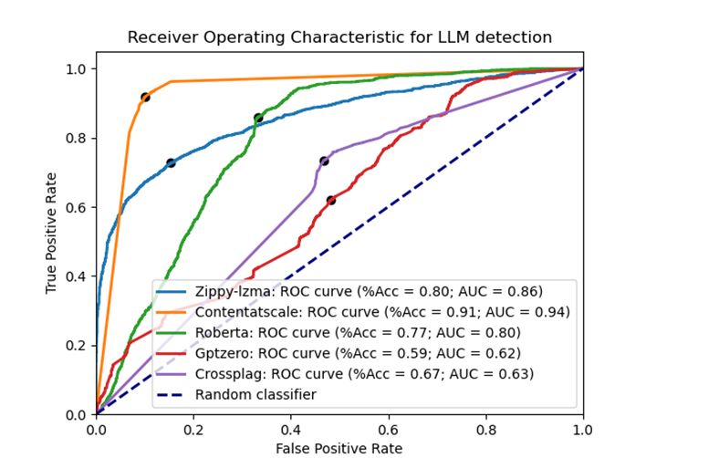 Here’s a graph comparing all four AI detectors with the LZMA and zlib detectors across the test datasets: