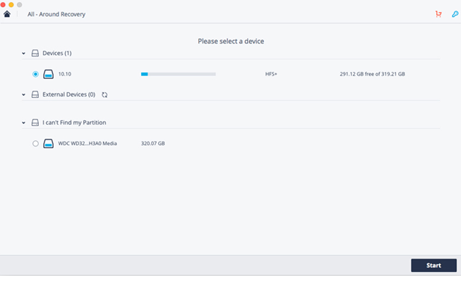 You need to get your hands on the device that possesses the files you want to extract with the help of your disk recovery software Mac. After connecting this device to the system, make sure to click the “Start” icon as in this image.