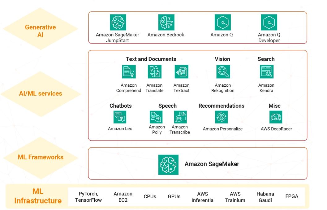 Generative AI: this is the top layer that offers tools and services specifically designed for generative AI tasks.