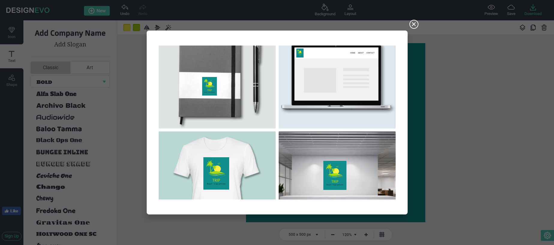 DesignEvo has various previews, e.g. logo on a T-shirt, logo in a website, logo on a book cover and so forth. The purpose is to let you see how your logo will appearto its audiences in different occasions, WYSIWYG. Additionally, the output service is more delightful and optional. DesignEvo supplies jpg, png, png transparent and svg for logo download. A user has to choice a plan for the logo download. Only Plus plan supports vector images.