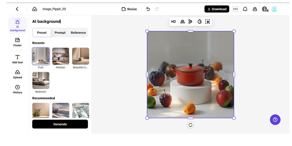 Pippit makes the procedure quick, simple, and beautiful, whether you’re enhancing colours, enhancing shadows, or swapping out a boring background for something eye-catching. Create compelling transformational stories that win over viewers by combining its AI background generator and image enhancer.